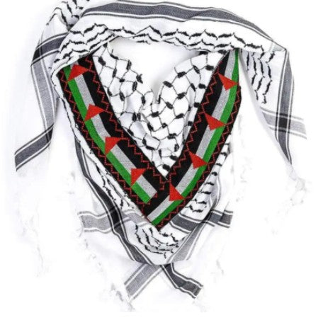 Keffieh palestinien original noir et blanc (ARAFAT) brodé avec le drapeau palestinien